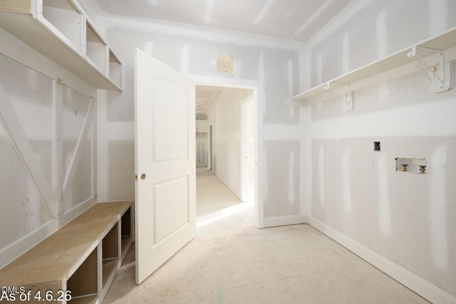 A practical mudroom with drop zone bench and laundry area adds convenience to daily life. The primary suite offers a peaceful retreat with a spacious walk-in closet and a spa-inspired bath complete with dual vanities and a walk-in shower. A dedicated study provides the perfect space for a private home office, flex room, or quiet retreat.