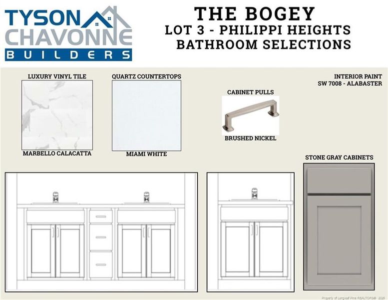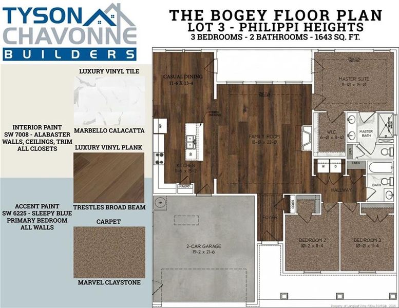 The Bogey floor plan by Tyson Chavonne Builders offers the perfect balance of thoughtful design and everyday livability, set on a homesite with a preserved tree line along the back for a more natural, private backdrop.Inside, 9’ ceilings and an open-concept layout create a bright, connected living space where the kitchen, casual dining area, and family room all flow together seamlessly. Whether you're hosting or just enjoying a quiet night in, the layout keeps everyone within sight and part of the moment.The kitchen stands out as a true focal point, featuring crisp white cabinetry, a Teramoda Sky subway tile backsplash, and an abundance of counter space and storage. Soft-closing cabinets and drawers add a refined touch, while the overall design balances style and function in a way that feels both elevated and practical.With 3 bedrooms and 2 full bathrooms across 1,643 square feet, the layout is efficient without feeling tight. The owner’s suite is positioned for privacy, while the secondary bedrooms offer flexibility for guests, a home office, or additional living needs.This home also features a shared driveway with Lot 2, creating an extended approach that adds depth to the homesite while maintaining a clean, streamlined look.If you're looking for new construction that blends modern finishes, functional design, and a setting that still feels connected to nature, the Bogey delivers a refreshing alternative to the typical build.