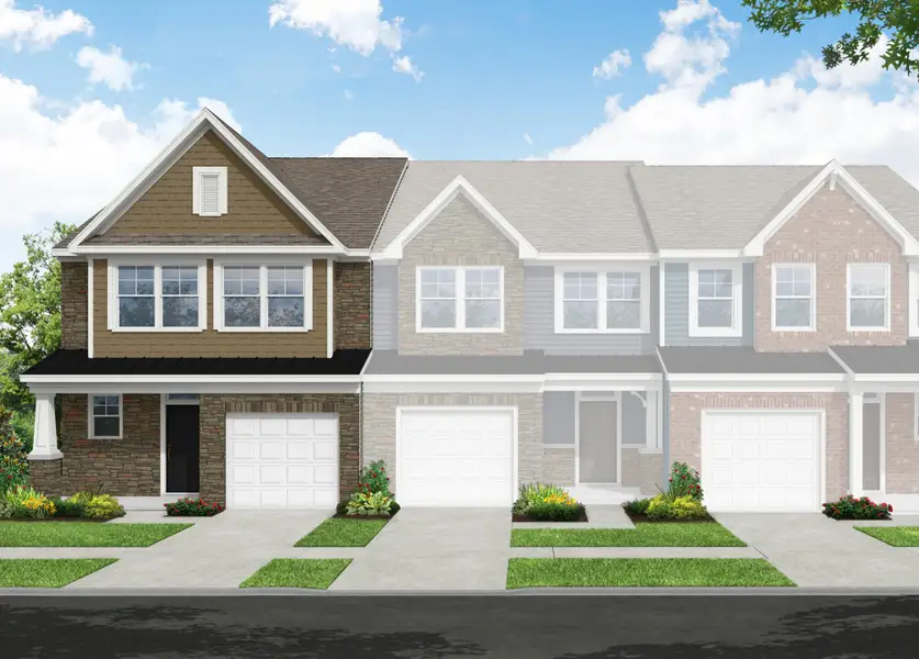 The Cary is a two-story, three-bedroom, two-and-a-half-bath townhome with a one-car garage, first-floor primary suite, spacious family room, and dining area, covered rear porch, and an upstairs loft that overlooks the two-story family room, and a finished storage area.