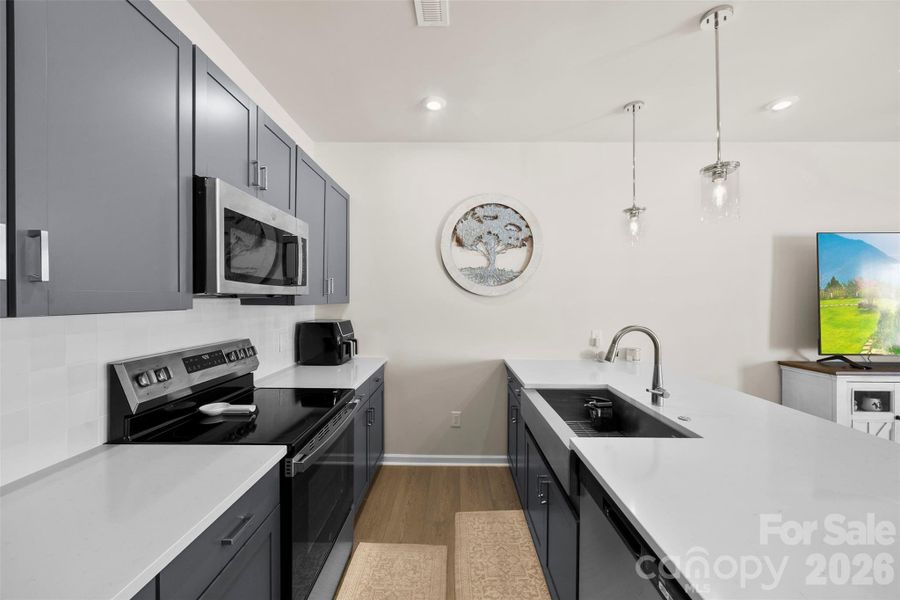 This move-in-ready townhome offers a comfortable and welcoming environment with an open floor plan, 9-foot ceilings and a thoughtful design throughout making it ideal for both daily living and entertaining. The main level features a modern kitchen with brand-new appliances, a living area with a ceiling fan, a dining area, and a convenient half bath.