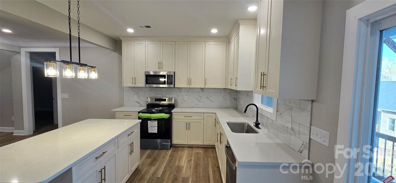 The kitchen showcases custom all-wood cabinetry, quartz countertops, a large island, and a convenient coffee bar for added storage and prep space. Complete with a full new appliance package, this home blends style, comfort, and functionality.