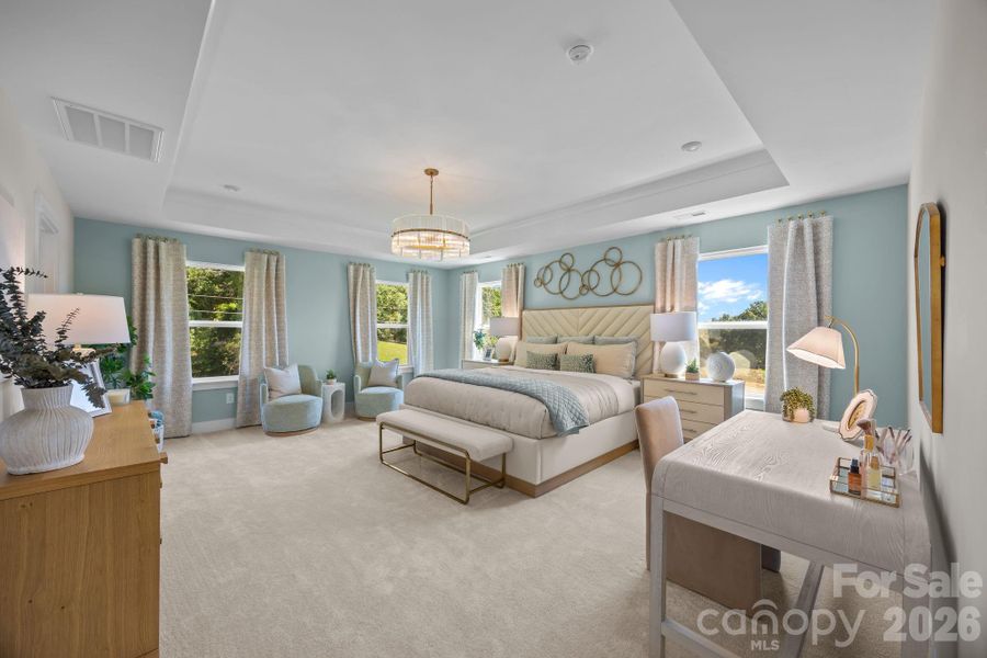 The primary suite is privately positioned and features a tray ceiling, a walk-in closet, a dual vanity, and a tiled walk-in shower. Two additional bedrooms, a full bath, and an upper-level laundry room complete a layout that is both efficient and highly livable.