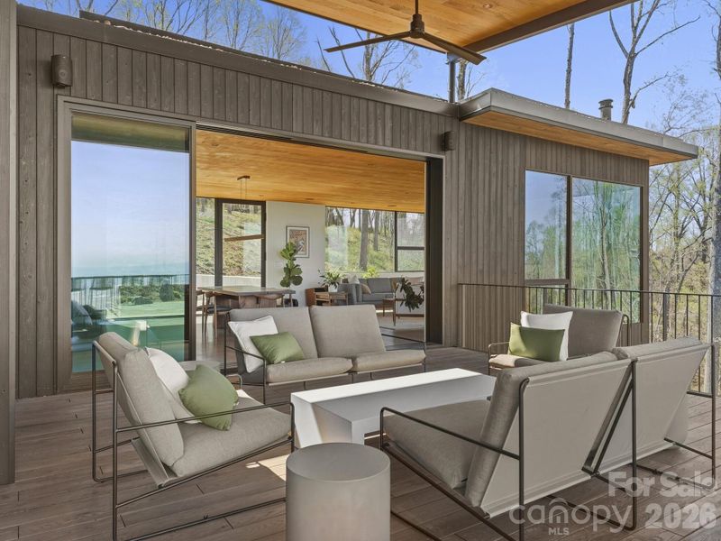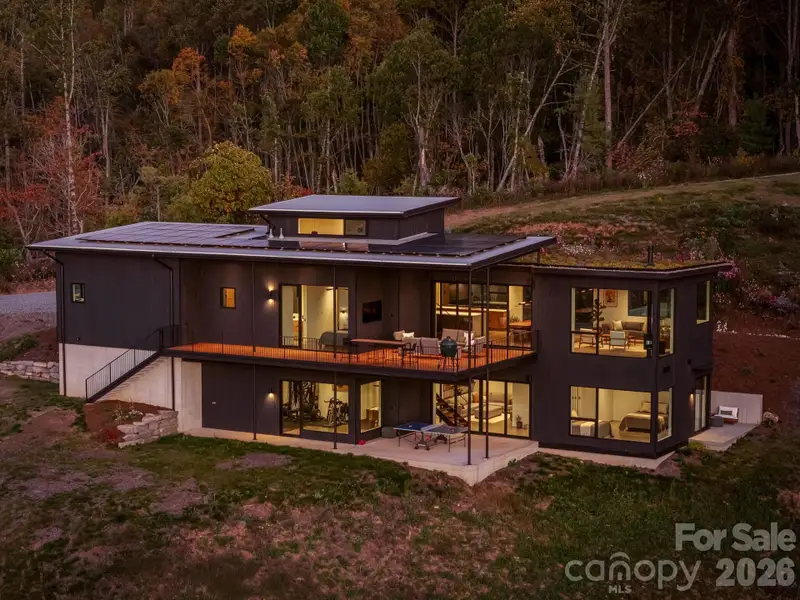 Winner of 2025 Parade of Homes Gold Awards for Craftsmanship and Green Certification. Expansive glass and natural materials seamlessly connect this home to the surrounding forest and distant mountain views. A restrained palette of concrete & steel, charred cypress, white oak & black walnut, and consistent, minimalist details allow nature to be the focal point. Enter through the sunken patio garden into the heart of the home under a 2,000sf living roof. An open floor plan spans the inviting glass-lined living room, a gracious central dining area, and flows through a 16ft wide opening to the covered porch with panoramic mountain sunsets. The stunning sunrise-kissed kitchen inspires culinary creativity with warm wood tones & clean quartzite countertops paired with the finest Fisher & Paykel integrated appliances, the perfect pantry, and a baker's nook. The primary bedroom boasts some of the best views in the house. Enjoy an elevated en-suite bath with quarter sawn oak cabinetry, a handmade tile & frameless glass shower, and a well appointed walk-in closet. An upper level office provides a close, yet secluded workspace with astounding long range & forest views. Downstairs is centered on a sumptuous media lounge that's open to a covered patio and big beautiful views. Two bedrooms flex into one shared space with a retractable wall. The game & fitness room works for anything, including a large fourth bedroom. And there's a secure & conditioned 6x12 wine cellar. Back on main, an oversized carport lends access to a conditioned workshop/studio space that can easily connect for an expanded primary suite. Minimalism has been maximized with a conscious curation of exactly what one needs. Sustainability & efficiency abound as this home earns the record highest GreenBuilt Platinum Level Net Zero and Regenerative certifications in NC. A 15.79 kW solar system with 15 kW of battery storage keeps the power on even if grid is down. Comfort & healthy indoor air quality are certain with 2 geothermal heat pumps providing radiant floor heat, ducted cooling, and whole house ventilation & dehumidification. Ask for attached specifications, floor plans, awards & certifications. This place embodies intentional design, award winning craftsmanship and green building techniques, and an eco-conscious, luxury lifestyle. A second building lot is included with direct access to Elk Mtn and offers another home site that supports mutual privacy. Two other adjacent lots and significant additional acreage available. Inquire for details.