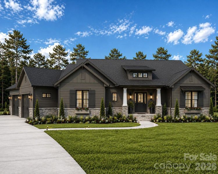 From the moment you arrive, the home is intentionally positioned to create a sense of quiet separation. A gently curving walkway leads from the driveway to the front porch, guiding you through a professionally designed landscape that feels established, yet understated. The architecture blends clean lines with natural materials, dark siding, stone accents, and layered rooflines, creating a look that is both current and timeless.