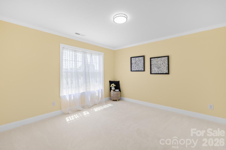 Upstairs, the primary suite is the kind of room you don't rush out of. Trey ceiling, plush carpet, windows on three sides, and an en suite bath with a double vanity, quartz countertops, and a frameless glass shower tiled floor to ceiling. Two additional spacious bedrooms share a full bath, and two generous loft spaces give the upper level a flexibility that most homes simply don't have. Home office, media room, craft studio, guest lounge. There's also an upstairs laundry room that makes everyday living easier.