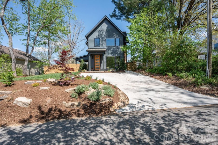 Beautifully designed GreenBuilt + Energy Star certified home offers high-efficiency, low-maintenance living in the heart of West Asheville. Light-filled open floor plan features oversized windows with custom blinds, hardwood floors, and modern light fixtures throughout. Showcasing a sleek electric fireplace and custom built-ins, the airy and bright living room flows to kitchen and dining. Ready for your home chef, the elegant modern kitchen is complete with a large center island, quartz countertops, natural cherry cabinets, tile backsplash, and an induction stove. Escape to the well-appointed primary suite on the main floor, offering a walk-in closet accessed via a pocket door and a spa-like bathroom with a double-sink-quartz-top vanity and a handsome step-in shower. Upstairs, three versatile bedrooms and a dedicated laundry room provide ample space for guests, media room, or home office. Glass French doors lead to a covered patio overlooking a manicured lawn, where a custom privacy fence and native landscaping perfect the refined setting. Enjoy all West Asheville has to offer - just a half-mile from the vibrant dining and entertainment of Haywood Road and only minutes to Downtown Asheville.