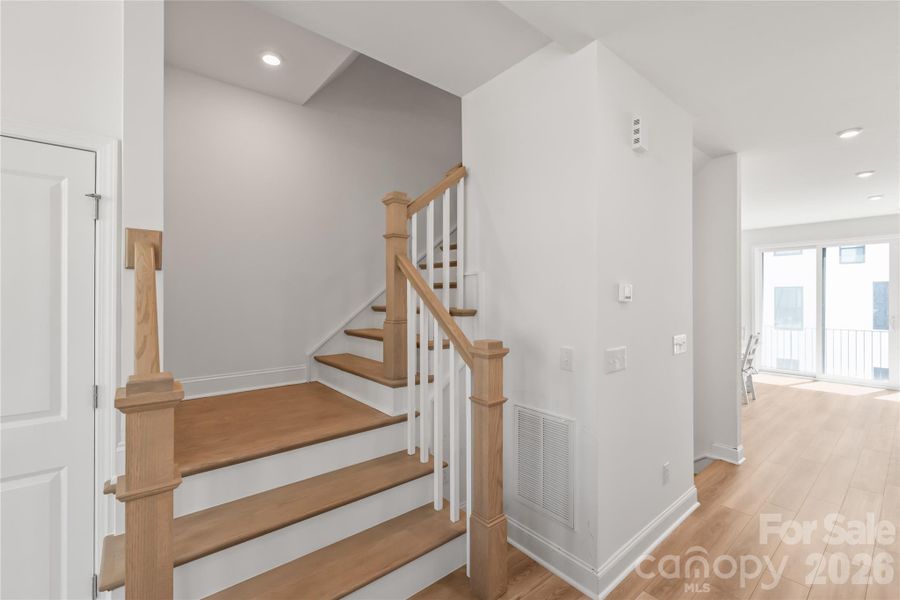 Three-level townhome with all bedrooms located on the third floor. The first level features a flexible space ideal for a home office, gym, or additional living area, along with a 2-car rear-load garage. The bright and open second level features a spacious great room and a gourmet kitchen designed for entertaining, complete with an oversized island, stainless steel appliances, 5-burner electric drop-in cooktop, wall-mounted range hood, wall oven, wall microwave, tile backsplash, and stainless steel undermount sink.