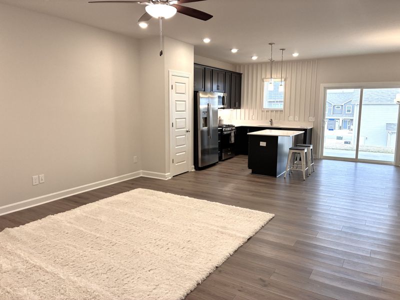 This home has a Self-Tour option above. This Custom Curated Santa Barbara style Carson plan has a spacious living room with Minka ceiling fan, LED disc lights and under stair Pet Cubby that leads right into a lovely open concept kitchen and dining area. Sherwin Williams City Loft interior paint keeps this home fresh and light but with a hint of classic sophistication. 5” wide Polaris Wild Dunes luxury vinyl plank flooring throughout 1st floor main living areas and window lined dining area lets just the right amount of light in. Kitchen includes Fulton Harbor blue cabinets, Fashion White Quartz countertops, under cabinet lighting, Satin Nickel modern hardware and Fulton Harbor blue Island which creates a move-in-ready, perfectly designed kitchen for those who love to cook and entertain at the same time. GE Stainless appliances include gas range, over-the-range microwave and dishwasher. This 3 bedroom, 2 ½ bath with Shaw Midway Plaza Pebble carpet in second floor bedrooms. Laundry room comes complete with hook up for washer /dryer and shelving for all your laundry accessories. Spacious owner’s bedroom with Tray Ceiling, Minka Ceiling Fan and walk-in closet. Beautifully designed owner’s bath has a full walk-in shower, York Graphite-stained cabinets, Arctic White Quartz top double vanity with white undermount sinks and Sublime Vision Gemini resilient flooring. Been looking to create that cozy outdoor space, well now you can on your own rear covered porch. Just the right size for an outdoor loveseat, couple of chairs, outdoor rug and voila…. Your private Outdoor Oasis!
