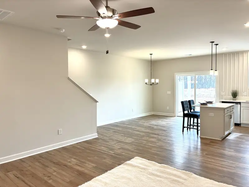 This Home has a Self-Tour option above. Stunning! This Custom Curated Carson plan has a spacious living room with Minka ceiling fan that leads right into a lovely open concept kitchen and dining area. Sherwin Williams City Loft interior paint keeps this home fresh and light but with a hint of classic sophistication. 5” wide Revered Portchester Oak luxury vinyl plank flooring throughout 1st floor main living areas and window lined dining area let’s just the right amount of light in. Kitchen includes Fulton Shell off white cabinets, Carrara White Quartz countertops, Matte Black hardware and Fulton Shell off white island which creates a move-in-ready, perfectly designed kitchen for those who love to cook and entertain at the same time. GE Stainless appliances include gas range, microwave and dishwasher. This 3 bedroom, 2 ½ bath includes Shaw Midway Plaza Pebble Creek carpet in second floor bedrooms. Laundry room comes complete with hook up for washer /dryer and shelving for all your laundry accessories. Spacious owner’s bedroom with Tray Ceiling and walk-in closet. Beautifully designed owner’s bath has a full walk-in shower, Fulton Shell off white cabinets, Frost White Quartz top double vanity with white undermount sinks and Origins Aurora resilient flooring. Been looking to create that cozy outdoor space, well now you can out on your own rear covered porch. Just the right size for an outdoor loveseat, couple of chairs, outdoor rug and voila…. Your private Outdoor Oasis!