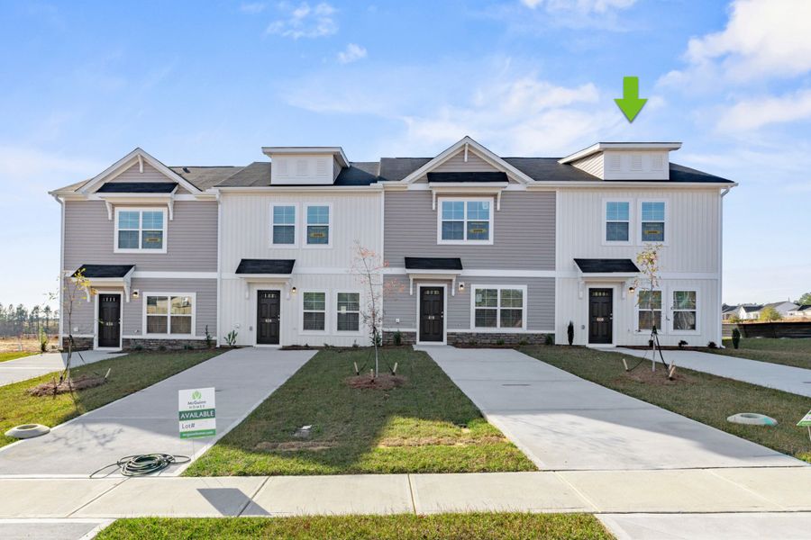 Exterior Unit! Move-In Ready! The Aspen is a beautifully designed living space, offering 1,300 sq. ft. of modern, open-concept living with three bedrooms and 2.5 bathrooms. Step inside to a welcoming foyer that flows effortlessly into the bright dining area and stunning plantation island kitchen, complete with a walk-in pantry for added convenience. The great room spans the entire back of the home, bathed in natural light and perfect for relaxing or entertaining. A powder bath is tucked off to the side, while the back door leads to a private patio, creating the perfect outdoor retreat.