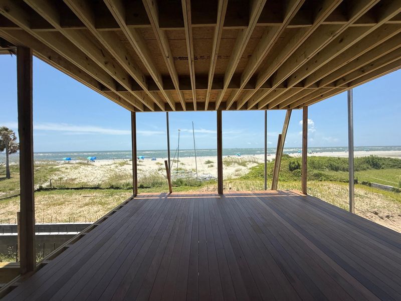 The primary bedroom suite is located on the second level overlooking the ocean with large picture windows and access to the secluded second floor porch. In the primary bath; a soaking tub sits in front of another large picture window, with two vanities, shower, and water closet to round it out. A coffee station and massive walk-in closet are at the front of the suite. A secondary guest suite is located on the other ocean side of the house with a large picture window and access to the porch. An ensuite bath and custom closet are also planned for this suite.