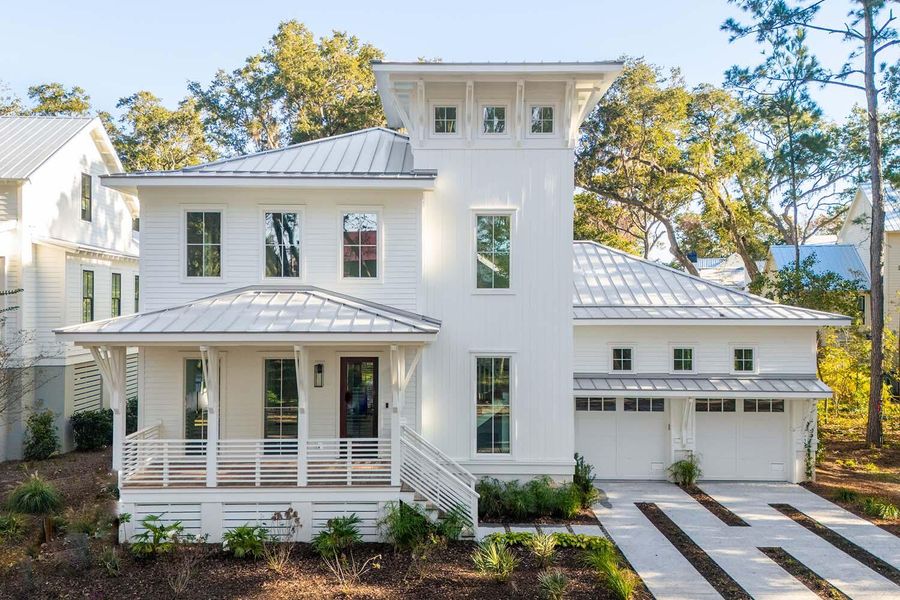 This meticulously crafted Lowcountry home blends coastal design with elevated functionality. Situated overlooking Kiawah River's new neighborhood park. The exterior showcases a sleek metal roof, wood-stained front door, and smooth stucco finish--complemented by dark bronze accents and designer lighting that add a modern touch with coastal appeal. Inside, soaring ceilings, painted tambour accents and wide-plank French white oak flooring create warmth and openness throughout the thoughtfully designed floor plan. The kitchen captures the essence of coastal modern style, with a rounded white island showcasing decorative tambour end panels, quartz countertop,Monogram appliances, and warm wood-toned cabinetry. Just beyond, a spacious scullery adds convenience with its own wall oven, microwave, wine unit, and second dishwasher.