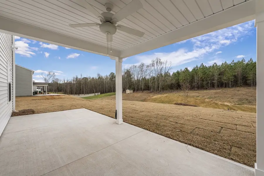 This home will impress you from the moment you see its modern white vinyl exterior with blue accents. You can easily envision yourself sitting on the large front porch. Upon entering, you will find a spacious great room that is perfect for entertaining family and friends. The upgraded kitchen features stainless steel gas appliances, shaker-style white cabinetry, and granite countertops. At the back of the home, there is a versatile flex room that can serve as a home office or playroom. The windows allow for great natural light and offer glimpses of the wooded backyard, which is over half an acre. Upstairs, there is plenty of space to spread out, with a spacious loft ideal for movie nights and three secondary bedrooms that provide ample storage. The primary suite is equally impressive, boasting plenty of closet space, quartz countertops with dual sinks, and a five-foot shower. Come see this wonderful home today in Fairview Falls!