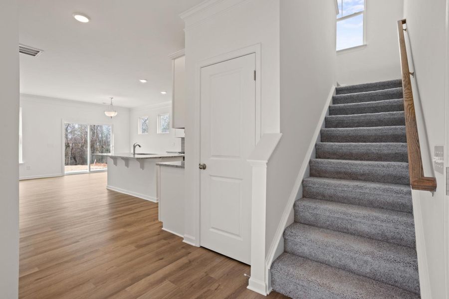 The Clayton is a two-story, four-bedroom, two-and-a-half-bath home with a home office, spacious family room, kitchen with an island, a walk-in pantry, and a separate breakfast area. The second floor features all four bedrooms, including the primary suite with an oversized walk-in closet, two secondary bedrooms, an additional full bath, a separate laundry room, and an additional bedroom.