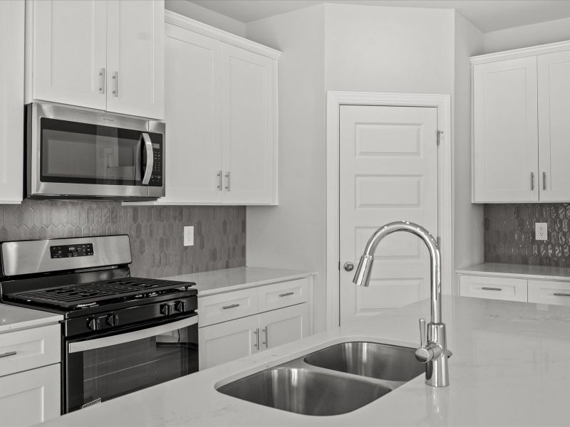 At the heart of the open-concept main level, the kitchen boasts an island perfect for entertaining. White cabinets with white quartz countertops, EVP flooring, and grey bath and flooring in our Lush Package.
