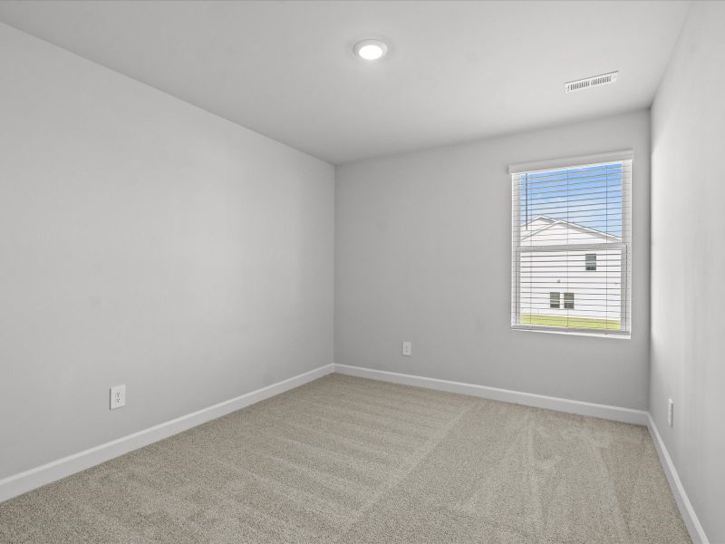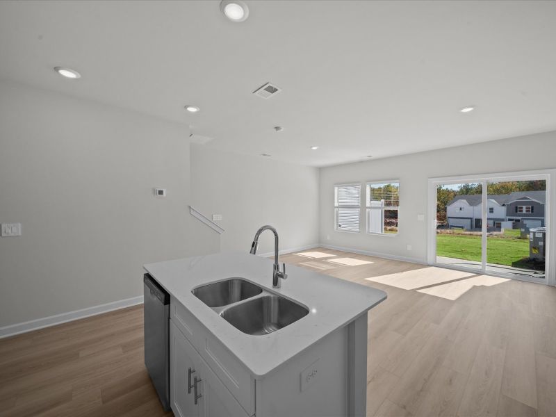 The primary suite features dual sinks and a large walk-in closet. Downstairs, the kitchen island overlooks the great room and dining area. White cabinets with white quartz countertops, EVP flooring, and carpet in our Essence Package.
