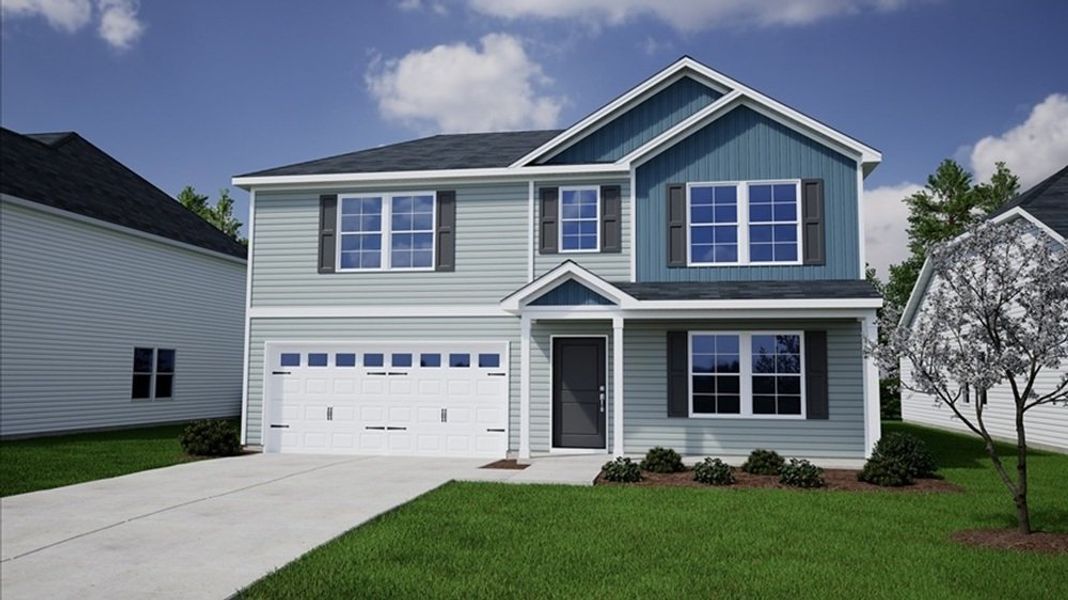 This popular Russell plan features four bedrooms and two full bathrooms, and the powder room is located on the main floor. There is an office with nice French doors as you enter the house. The kitchen features a large island and pantry, opening to the eat-in and great room, which opens out to a sizeable covered porch. All bedrooms, plus a large open loft, are located upstairs. The primary bedroom has dual walk-in closets, and the large bathroom features an over-sized linen closet and a wide walk-in shower. All other bedrooms feature walk-in closets and the laundry room is also conveniently located adjacent to the bedrooms.