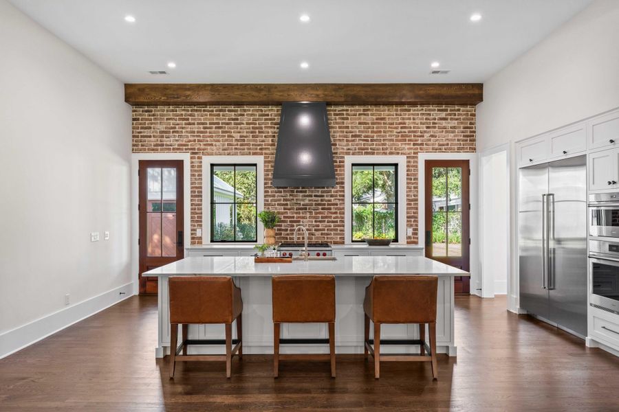 Experience unparalleled elegance and one-story living in this stunning custom-built residence, located on nearly half an acre in one of the most sought-after neighborhoods in Mount Pleasant. Every detail has been meticulously crafted for modern living. The main living area boasts soaring 12-foot ceilings and 8-foot interior doors, creating an inviting and airy atmosphere. A brick masonry fireplace, custom wood beams and oak flooring are highlights in the main living space. The heart of the home is the gourmet kitchen, featuring top-of-the-line Wolf appliances, including a cooktop, oven, convection oven and hood, complemented by a Sub-Zero refrigerator and freezer. It showcases exquisite natural stone countertops and custom inset cabinetry, along with a spacious butler's pantry, perfect for entertaining. Relax in the luxurious primary suite, complete with blackout window treatments and large walk-in closets. A soaking tub, spacious zero-entry shower and a dual sink vanity are notable highlights. Two guest bedrooms with walk-in closets and en suite tiled shower bathrooms have the same high-quality finishes. A private office is equipped with a built-in desk and access to the front porch. The laundry room offers beautiful herringbone brick floors, storage and a hanging rack. Additional highlights include mahogany doors, custom lighting from Hubbardton Forge, nine-inch trim and shiplap accents in the foyer, powder room, office and primary suite.
