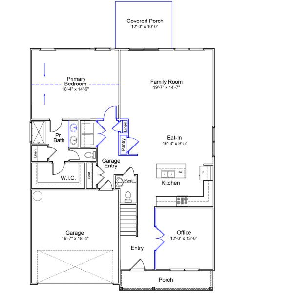 This Pickens floor plan is a two-story home with four bedrooms and two-and-one-half bathrooms. An office space is available just inside the front door. You'll also find an open kitchen, eating area, and great room with a covered porch out back. The primary bedroom has a vaulted ceiling and leads to the primary bathroom and a generous walk-in closet. Each bedroom upstairs also has a walk-in closet, and these rooms share another full bathroom. In addition, the second floor contains a loft with extra storage space.