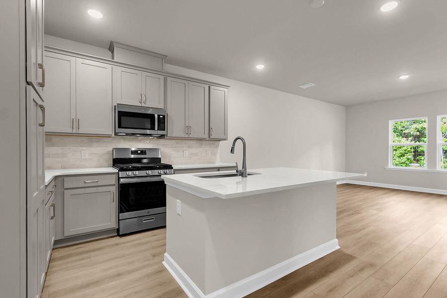 This two bedroom two bathroom villa backs to an HOA tree buffer and has an extended back covered porch and patio slab area, perfect for sitting out and enjoying the lowcountry breeze! The home has grey shaker cabinets, quartz countertops, gas appliances, and designer backsplash. The main areas have luxury vinyl plank flooring for easy cleaning, and the primary bedroom faces the backyard and trees beyond.