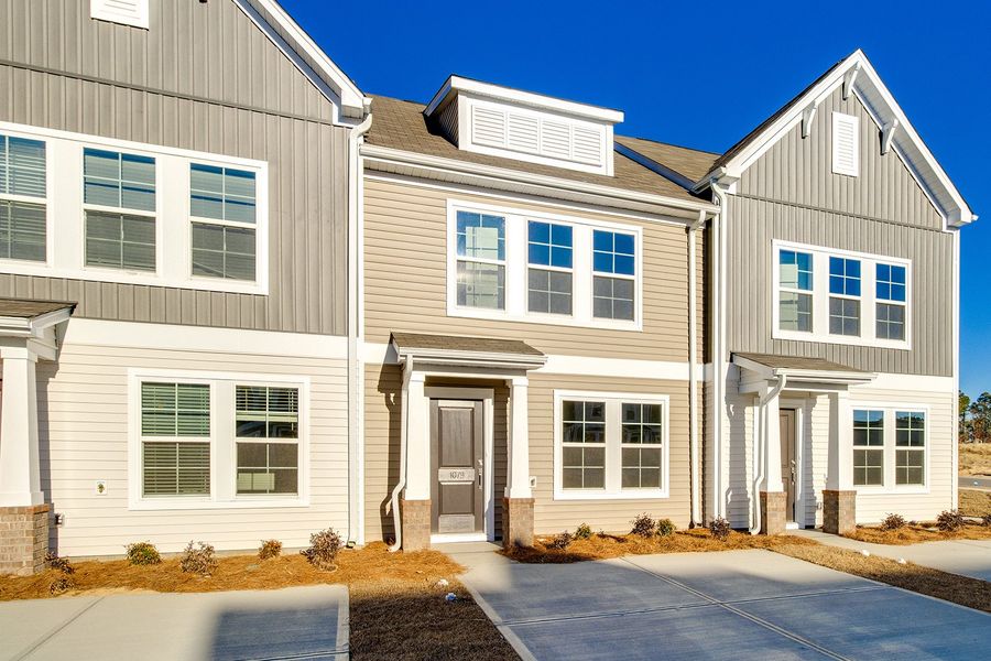 This Laurens A features three bedrooms and two-and-one-half bathrooms and has a very warm and cozy feel. The first floor features a large great room, an eat-in area, and an open kitchen equipped with bright white shaker cabinetry, beautiful Dallas white granite countertops, soft beige luxury vinyl plank flooring, stainless steel appliances, pendant lights above the kitchen sink, and a generous pantry. Additional first-floor amenities include a powder bathroom and a convenient laundry area. Upstairs, the townhome offers three well-sized bedrooms, including a beautiful primary bedroom with a large walk-in closet and an ensuite bathroom featuring a double-sink vanity and a walk-in shower. The home also boasts a fully fenced backyard with a large patio, ideal for relaxation or entertaining guests, plus an extra storage closet. Enjoy low maintenance living with an irrigation system and exterior home maintenance. The community offers future amenities with a pool, cabana, playground, fire pit, and sidewalks ensuring a comfortable and enjoyable lifestyle for all.