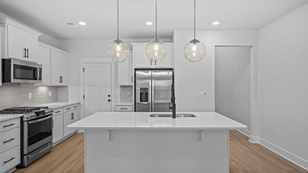 The spacious kitchen, with a large 7-foot island and modern stainless steel appliances, with an open concept flow to the adjacent dining area