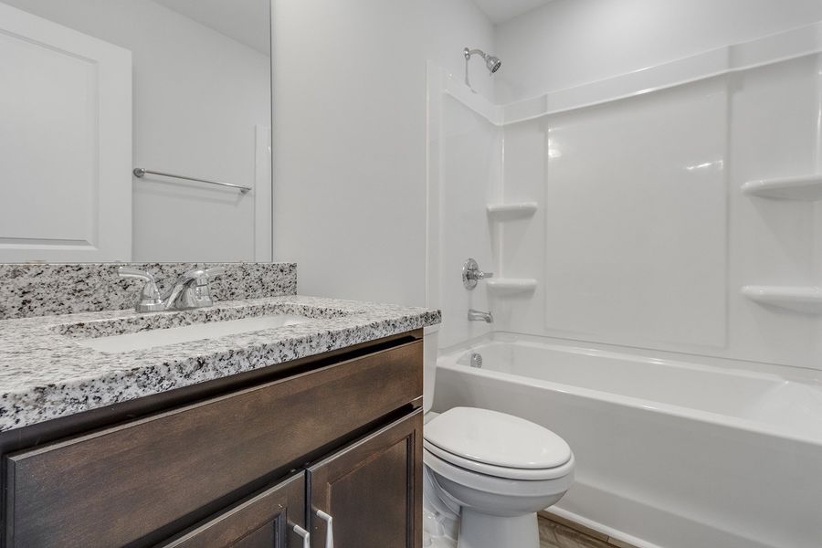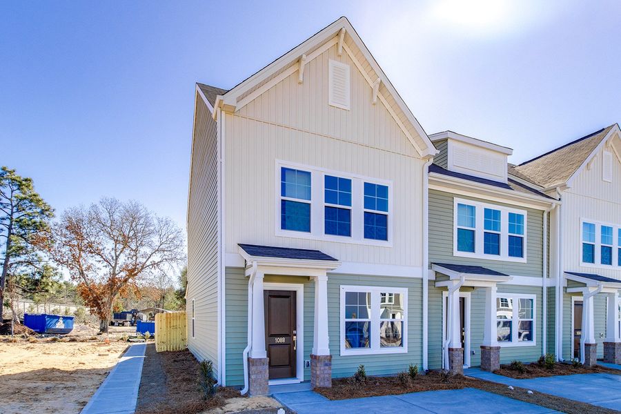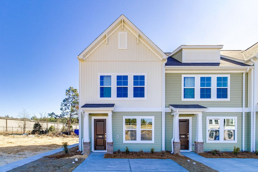 This Laurens B end unit features three bedrooms and two-and-one-half bathrooms and has a very warm and cozy feel. The first floor features a large great room, an eat-in area, and an open kitchen equipped with Dark Sarsparilla cabinetry, Luna Pearl granite countertops, Oyster Oak luxury vinyl plank flooring, stainless steel appliances, pendant lights above the kitchen sink, and a generous pantry. Additional first-floor amenities include a powder bathroom and a convenient laundry area. Upstairs, the townhome offers three well-sized bedrooms, including a beautiful primary bedroom with a large walk-in closet and an ensuite bathroom featuring a double-sink vanity and a five-foot tile walk-in shower. The home also boasts a fully fenced backyard with a large patio, ideal for relaxation or entertaining guests, plus an extra storage closet. Enjoy low maintenance living with an irrigation system and exterior home maintenance. The community offers future amenities with a pool, cabana, playground, fire pit, and sidewalks ensuring a comfortable and enjoyable lifestyle for all.