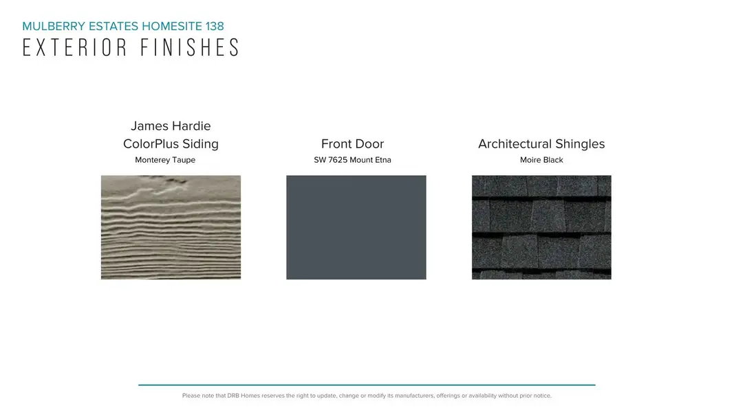 *Temporarily discounted promotional pricing (“Promotional Pricing”) for homesite 138 in the Mulberry Estates subdivision (Simpsonville, SC), as shown above, is not available for and may not be combined with any offer, promotion, or incentive offered by DRB Homes (including, without limitation, any closing cost assistance/contributions or other financial incentives offered by DRB Homes). DRB Homes may, in its sole discretion, and without prior notice, modify or discontinue the Promotional Pricing at any time. Additional limitations apply. See a DRB Homes sales consultant for more information.