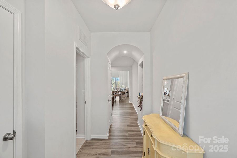 Luxury vinyl plank flooring flows seamlessly through the kitchen and main living areas. The main-level primary suite boasts a tray ceiling and a private ensuite with a walk-in shower, plus linen and wardrobe closets.