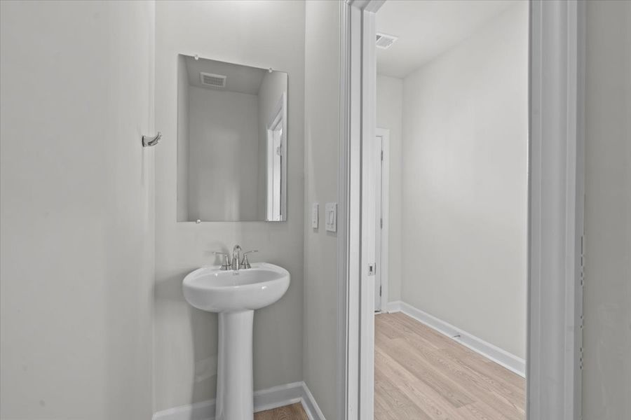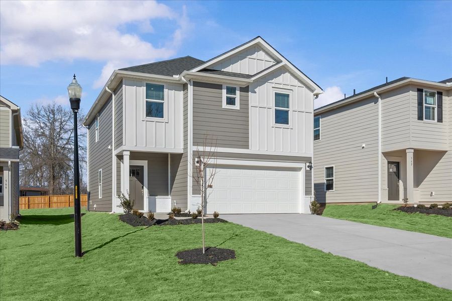 Prep dinner at the kitchen island while catching up with guests in the open-concept living area. Upstairs, the loft makes an ideal media room. White cabinets with white quartz countertops, EVP flooring, and grey bath and flooring in our Lush Package.
