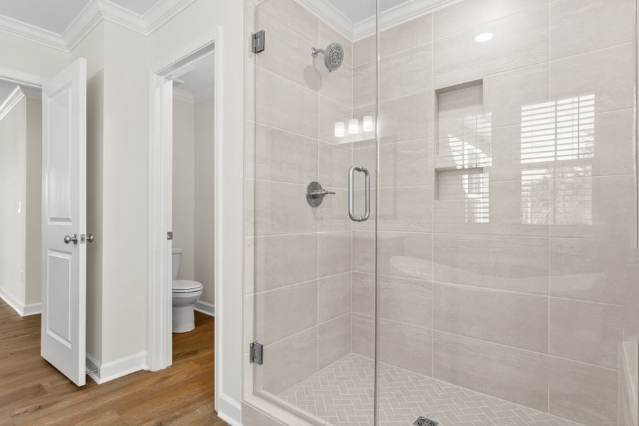 The Saluda II is a stunning four-bedroom, three-bathroom home with a three-car garage, thoughtfully designed with an open floor plan and luxury vinyl flooring throughout. Upon entering, you’re welcomed into a spacious great room that seamlessly flows into the kitchen and sunroom, creating an inviting space ideal for entertaining, holiday gatherings, or everyday living. The kitchen is a true centerpiece, featuring a large island, elegant quartz countertops, and a gas stainless steel gourmet appliance package. A convenient guest suite is located on the main level just off the great room, offering comfort and privacy for visitors. Upstairs, you’ll find three additional bedrooms, all with generous walk-in closets. The primary suite is a private retreat, complete with a spacious sitting area and a luxurious en-suite bathroom featuring a soaking tub and a large walk-in shower with a bench seat.