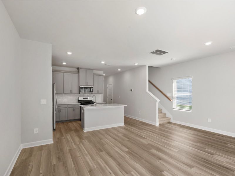 Kick your feet up after a long day on the back patio. Inside, the kitchen island overlooks the open-concept great room. Pebble cabinets with white quartz countertops, EVP flooring, and carpet in our Charm Package.