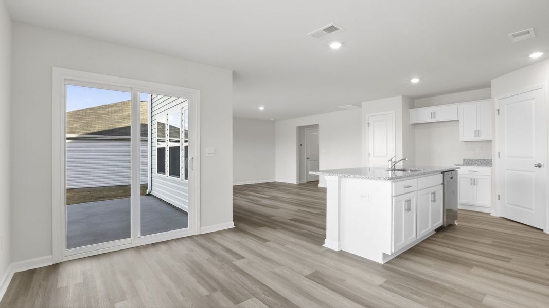 As you enter, you’ll be greeted by a welcoming foyer that leads into the heart of the home. The open-concept design seamlessly connects the kitchen, dining area, and family room, creating a perfect flow for daily living and entertaining. The chef’s kitchen is equipped with modern appliances, ample storage, a walk-in pantry, and a large center island, featuring both style and functionality for preparing meals or hosting guests.