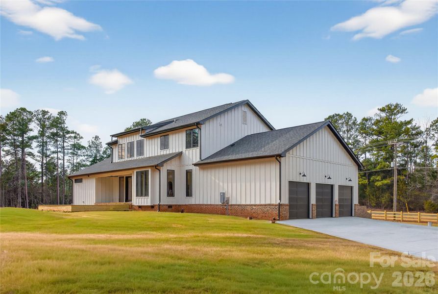 Beautiful new construction open plan 4 bed, 3-1/2 bath home on one acre (with option to purchase an additional one acre) with spacious three car garage. Enter through a spacious open foyer featuring a dining room with built in dry bar on one side and glass double doors to private study on the other complete with access to charming outdoor sitting area with pergola. Enter into the main living area with vaulted ceilings, white oak beams and tall exterior doors and windows looking to rear view trees. Kitchen has large island with waterfall quartz and gas cooktop which leads to back scullery with wall microwave oven, beverage center, sink and ample storage. Breakfast nook completes the kitchen with lots of natural light throughout. Convenient powder room sits off in hall from living room. Primary bedroom on first floor with outdoor access to pergola with trey ceiling detail, large bathroom, custom built in cabinetry, shower and bath wet area and walk in closet with convenient washer/dryer hookup. Mudroom with additional custom cabinetry is located off garage access and this leads to second floor with open flex space , three good sized bedrooms one with ensuite shower with the others sharing a jack and jill bathroom. A second washer/dryer is located off flex space as well as attic access. Flooring on first and second floor flex space is solid four inch white oak while bathrooms and bedrooms up have tile and carpet installed. All bathrooms have custom tile including shower pans. Upgraded fixtures have been thoughtfully installed as well as wall moldings, shiplap and trim work throughout. Appliances included are stove, oven, microwave, fridge, beverage center, wine cooler, washer and dryer. Black interior and exterior Marvin casement windows and doors, high lift garage doors, rear decking and custom iron railings to front entry and porch. Home is located only 15-20 miles from Rock Hill, Indian Land and Ballantyne shopping and amenities and only 10 minutes from Hwy 77. School district includes Van Wyck Elementary, Indian Land Intermediate and Indian Land High.