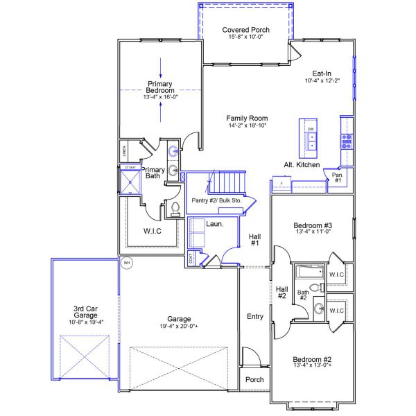 The Durham II is a one-story home featuring three bedrooms and two bathrooms. The kitchen is open to the great room and eat-in and includes an island with breakfast bar and two pantries for ample storage space. The primary suite is just off the great room and features a linen closet, water closet, and large walk-in closet. Two secondary bedrooms are located at the front of the home, and each have a walk-in closet. The garage entry is tucked away with a conveniently located coat closet. Options for this home include a fireplace, alternate kitchen layout, vaulted ceiling in the primary bedroom, and more.