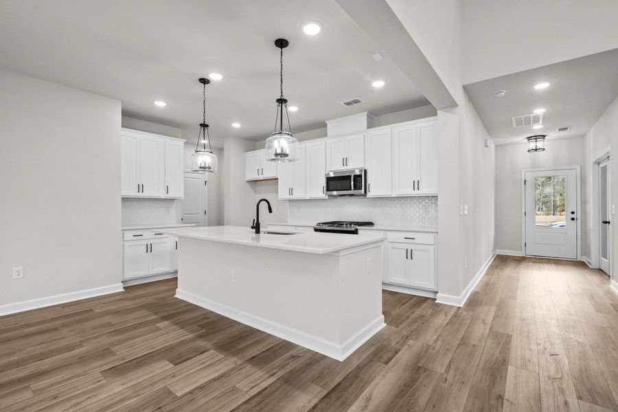 This is the one people keep asking about — and this particular homesite makes it even harder to pass up. The Monroe sits on a cul-de-sac lot backing to woods, giving you the kind of privacy and tree-lined views you don't get tired of coming home to. Inside, the Coastal Collection sets the mood with light oak luxury vinyl plank floors, ocean-washed backsplash tile, white shaker cabinetry, and quartz countertops that make the whole main level feel airy and effortless. The kitchen, breakfast area, and family room all connect in one open flow, with a flex space off the back and an extended covered patio where the wooded backdrop becomes part of your everyday.
