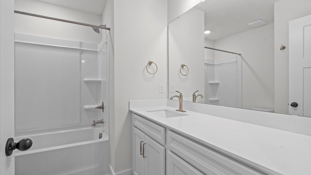 Upstairs, the second level offers two secondary bedrooms, each with walk-in closets, a full secondary bathroom, and a centrally located laundry room. The generous primary suite includes a large walk-in closet and an en suite bathroom complete with a dual vanity, water closet, and a tiled walk-in shower with bench seating.