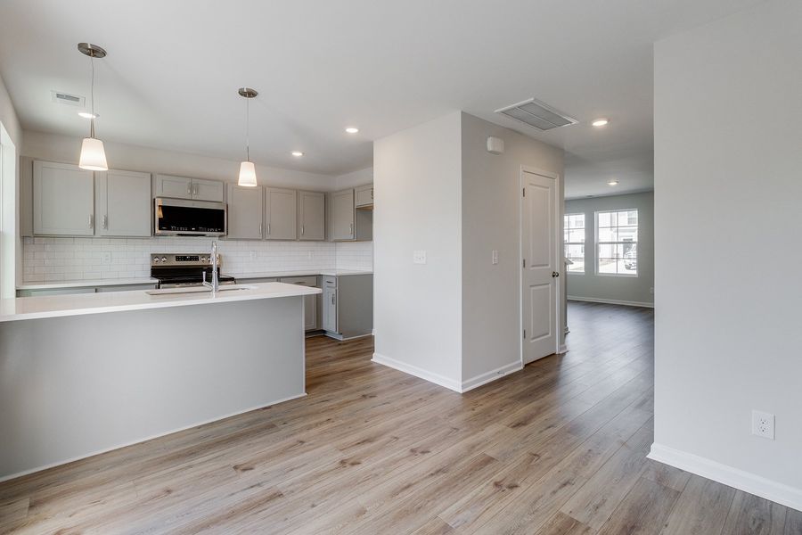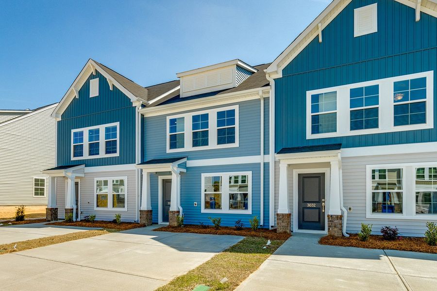 This Laurens A end unit blends comfort and modern style across three bedrooms and two‑and‑a‑half bathrooms. The main level opens with a spacious great room that flows effortlessly into the dining area and an inviting kitchen. Here, you’ll find gray cabinetry, Miami Vena quartz countertops, Wild Dunes luxury vinyl plank flooring, stainless steel appliances, pendant lighting over the sink, and a roomy pantry that keeps everything organized. A powder room and a convenient laundry area complete the first floor. Upstairs, the home offers three well‑proportioned bedrooms, including a serene primary suite with a generous walk‑in closet and a private ensuite bathroom featuring a five‑ft fiberglass walk‑in shower and a dual‑sink vanity. Secondary bedrooms are finished with concrete‑tone carpet, adding durability and comfort. The fully fenced backyard includes a large patio—perfect for outdoor dining, relaxing, or hosting friends—along with an additional storage closet for seasonal items. Enjoy low‑maintenance living with included irrigation and exterior upkeep. Future community amenities will feature a pool, cabana, playground, fire pit, and sidewalks, creating a welcoming environment for everyday enjoyment.
