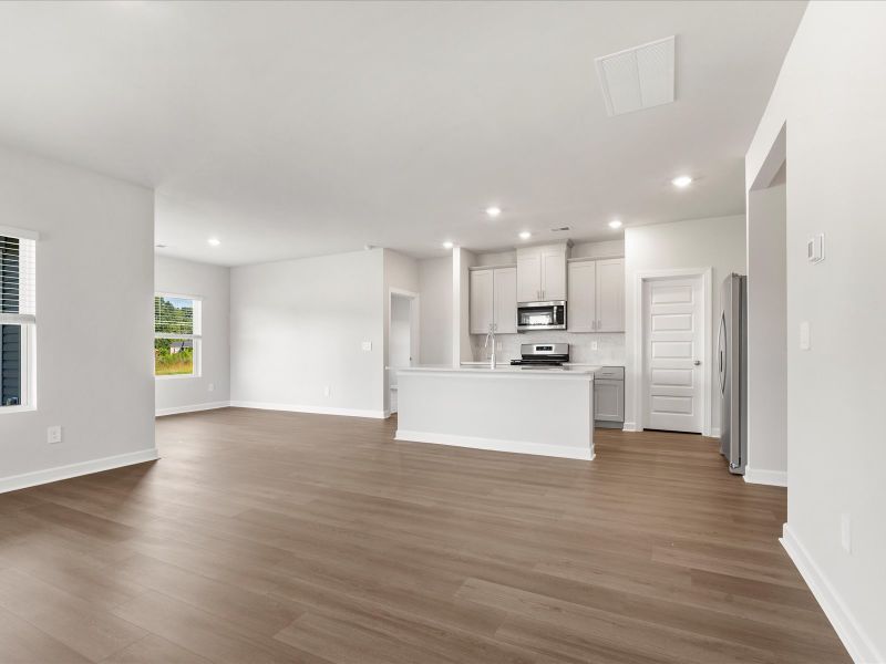 In the primary suite, dual sinks and a walk-in closet simplify busy mornings. Barnett Linen cabinets, sage flooring, and valor white quartz countertops come in our Bold Sophistication package.