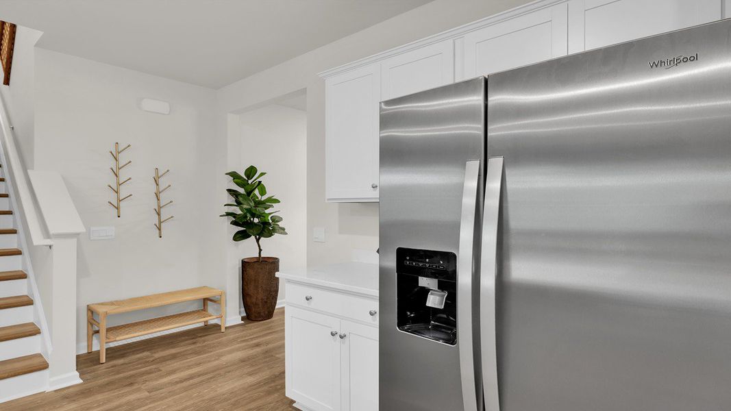 The kitchen is both stylish and functional, featuring a gas range with an exterior-vented hood, quartz island, gray cabinetry, and modern appliances including a refrigerator, dishwasher, and microwave. The island provides plenty of space for casual meals, morning coffee, or hosting friends while staying connected to the living area.
