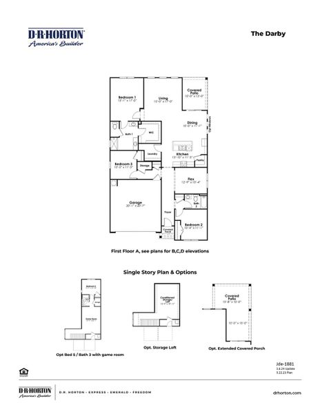 Our Darby plan offers three bedrooms and a flex room all on one level with the ability to add a second floor if you desire! The kitchen overlooks the dining and living areas and features a huge island with a breakfast bar, lots of cabinet space, and a walk-in pantry. The split bedroom floorplan creates a spacious and private primary bedroom suite.