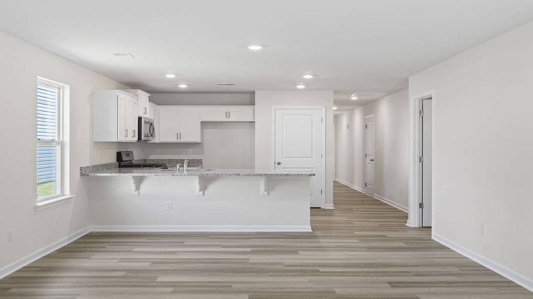 Upon entering, you’ll be greeted by a foyer inviting you to the center of the home. At its heart, you’ll find a spacious living room and kitchen. The chef’s kitchen has modern appliances, ample cabinet space, a pantry, perfect for cooking and casual dining.