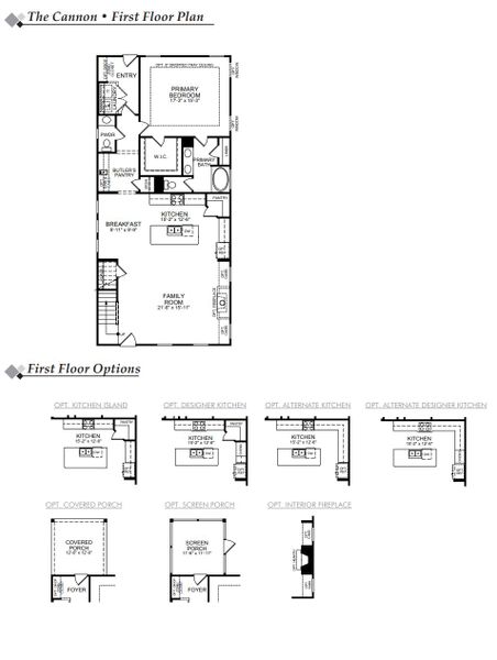 The Cannon is a three-bedroom, two-and-a-half-bath home with a first-floor primary suite, a spacious family room, an open kitchen, a butler's pantry, a second floor with a loft area, and a covered rear porch.