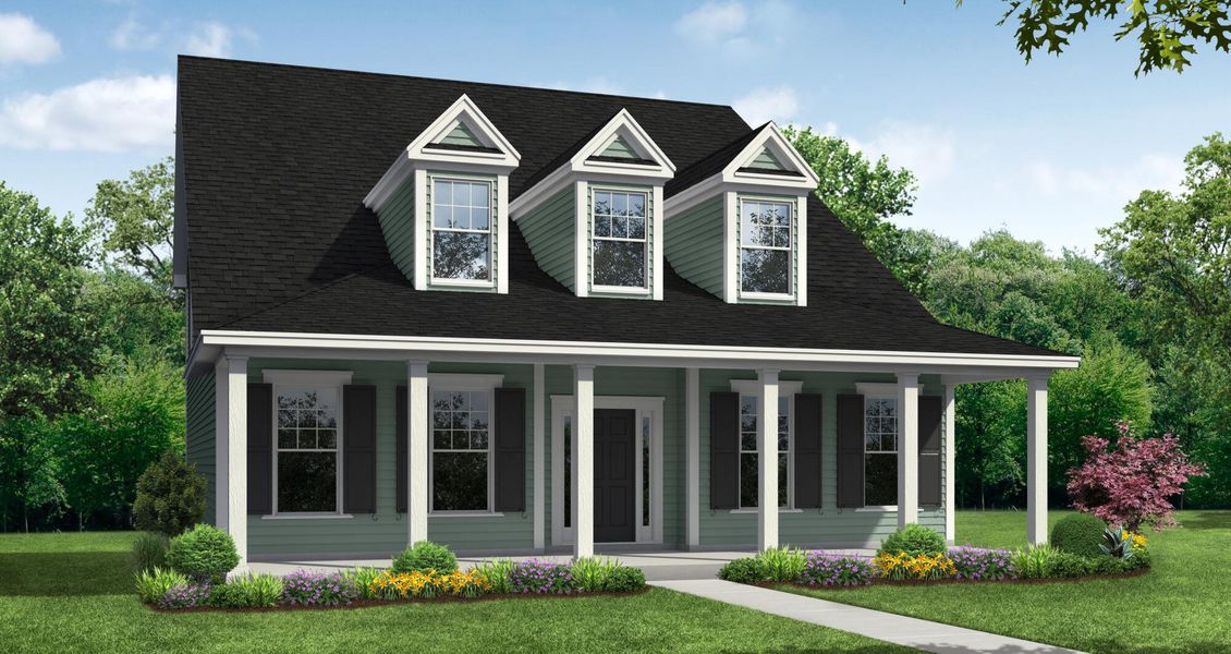 The Vanderhorst is a stunning two-story, four-bedroom, three-and-a-half-bath home with a huge rocking chair front porch, first-floor primary bedroom, formal dining room, office with French doors, kitchen with island, large pantry, and a covered rear porch. Upstairs are three oversized secondary bedrooms, including a Jack-and-Jill bath between bedrooms two and three, and an enclosed bonus room.