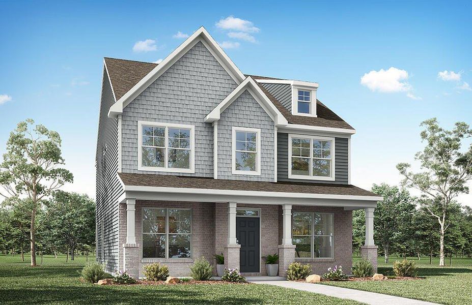 The Brinson is a three-bedroom, two-and-a-half-bath home with an alley garage, home office, formal dining room, spacious family room, kitchen with island and pantry, and a covered rear porch. The second floor features all three bedrooms, including the primary bedroom with an attached primary bath and large closet, plus an upstairs laundry.