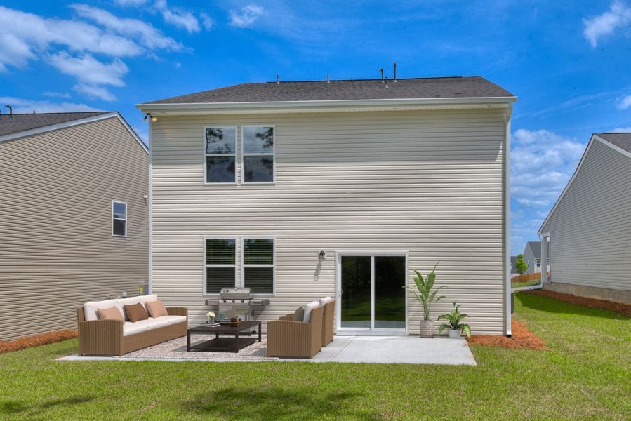At the heart of the home lies an open-concept area where the kitchen, family room, and dining area converge, creating an inviting space for both relaxation and entertainment. The kitchen is a chef's dream, equipped with a spacious island, abundant cabinetry, and a generous pantry, making meal preparation a delight. The family room features a cozy electric fireplace, while the dining area extends to a rear patio, ideal for outdoor gatherings. Upstairs, three additional bedrooms, each with their own walk-in closet, provide personal space for family or guests, complemented by a hall bath and a centrally located laundry room.
