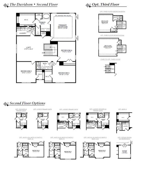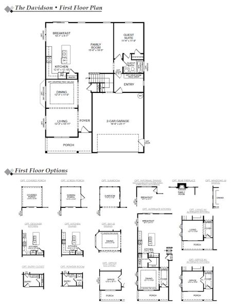 The Davidson is a two-story, four-bedroom, three-bath home with a formal dining room, spacious family room, kitchen with island, walk-in pantry, and butler's pantry, separate breakfast area, first-floor guest suite with a full bath, and a covered rear porch. The second floor features three bedrooms, including the primary suite, primary sitting room, a Jack-and-Jill bath, a large laundry room, and a loft area.