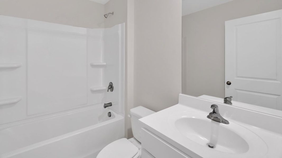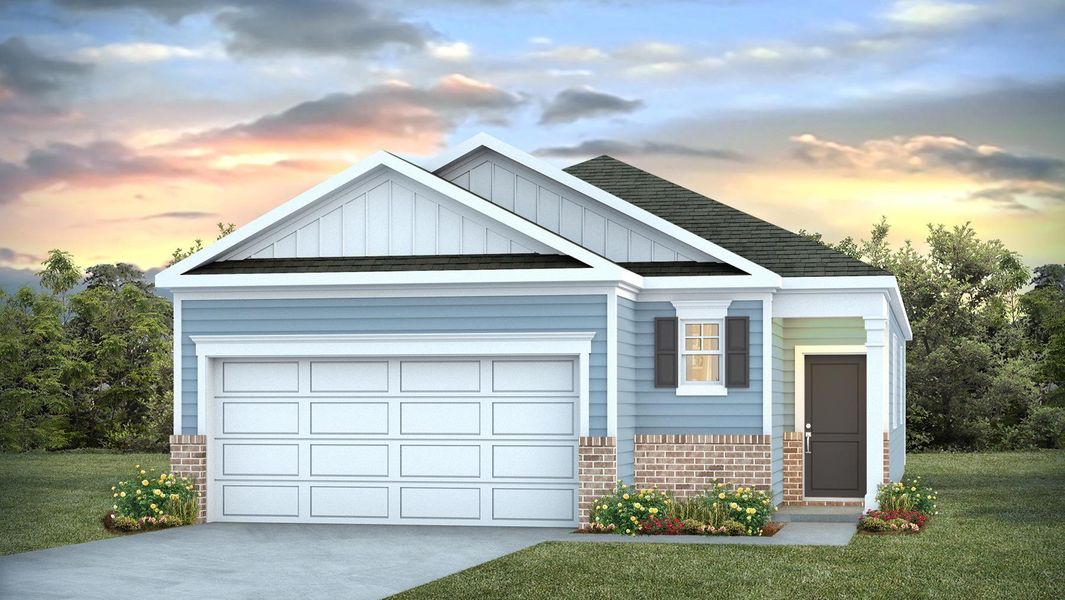 Welcome to the Allex floorplan in Ferry Grove! This home sits on a spacious lot that is nearly a quarter of an acre. The exterior features blue-colored vinyl with brick accents. Inside, the home features 3 bedrooms and 2 bathrooms with a split-bedroom design. This creates plenty of privacy as the primary bedroom is tucked into the back of the home with the remaining 2 bedrooms towards the front. The dining area welcomes you into the home off the front foyer with ample natural light. Following the natural flow of the home, the dining area leads into the kitchen and living areas. The kitchen features white cabinetry and white quartz countertops. The kitchen bar allows for barstool seating space. Glass sliding doors in the living area lead out onto the paved back patio where you can enjoy the peaceful atmosphere in Ferry Grove.