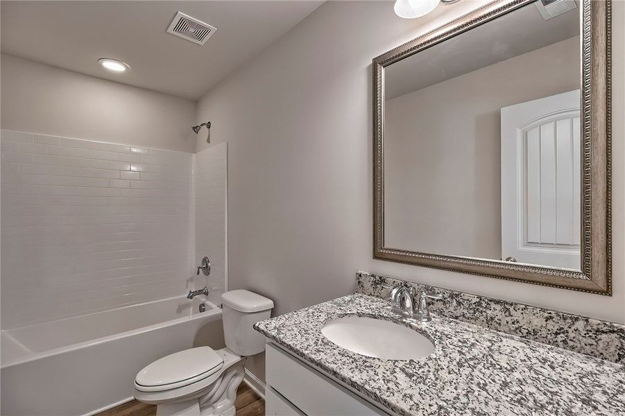 This newly improved Devonshire II A6 offers approximately 2500+ square feet of thoughtfully designed living space, featuring 4 bedrooms and 2.5 bathrooms with an open-concept layout ideal for both everyday living and entertaining. The exterior showcases a striking combination of white and sandy siding with brown stone veneer, a beautiful white front door with chocolate-colored shutters that complements the siding along with the stone colors. The interior is designed with modern finishes, including white cabinetry with nickel hardware, nickel lighting fixtures, white quartz countertops, coordinating white tile backsplash, and luxury vinyl plank flooring. The main level features a bright, open living area flowing seamlessly into the dining and kitchen spaces. The upgraded kitchen includes a large center island, quartz countertops, a gas fireplace, and stainless-steel ENERGY STAR® appliances, including a gas range, dishwasher, and microwave. Also on the main level are a flex room near the entry, a powder room, and access to the two-car garage. Upstairs, a spacious loft provides additional living space, along with all four bedrooms. The primary suite offers a private retreat with two large walk-in closets, dual vanities, a walk-in tile shower with fiberglass pan, tub, and contemporary fixtures. A dedicated second-floor laundry room adds everyday convenience. Energy-efficient features include a tankless gas water heater and HERS energy certification with third-party testing, providing long-term efficiency and cost savings.