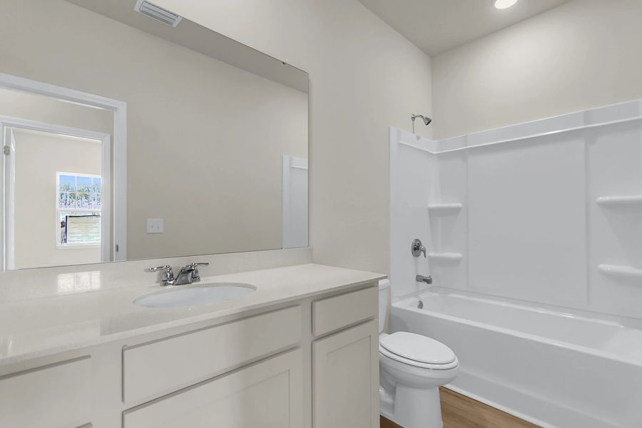This beautifully finished two bedroom villa has been thoughtfully designed with Ashton Woods' serene design collection, showcasing Alabaster cabinetry, a designer backsplash, and striking quartz countertops with elegant veining that give the kitchen a clean, elevated, modern appeal. Luxury vinyl plank flooring flows throughout the main living areas. The soft close cabinets and stainless GE appliances create a polished and functional cooking space. The primary bedroom is quietly positioned at the back of the home for added privacy, and its en suite bathroom features a framed shower and a spacious walk in closet, offering comfort and convenience in a relaxing retreat.